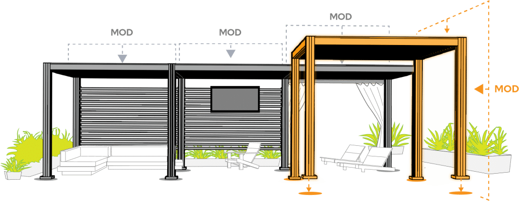 The StruXure Cabana MOD system is a versatile and modular outdoor structure. It begins with the core Cabana X unit, which can be customized and expanded in various configurations to adapt to different spaces and needs. The system offers flexibility in coverage, with options for different canopy and backdrop materials to precisely suit the user’s requirements for their outdoor space.